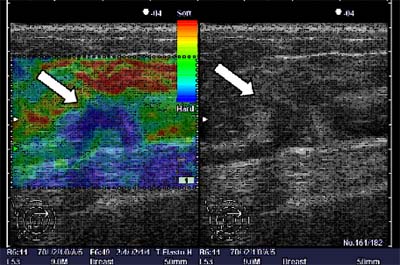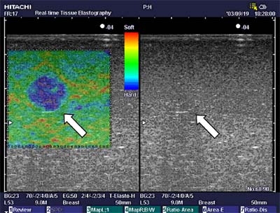 Al momento tale applicazione trova indicazione nello studio delle nodularità mammarie delle quali permette di conoscere le proprietà meccaniche (elastiche) e quindi l’eventuale rigidità del tessuto permettendo una caratterizzazione tissutale che nel caso della maggioranza della patologia nodulare maligna appare configurarsi come più “rigida” (figura 2).